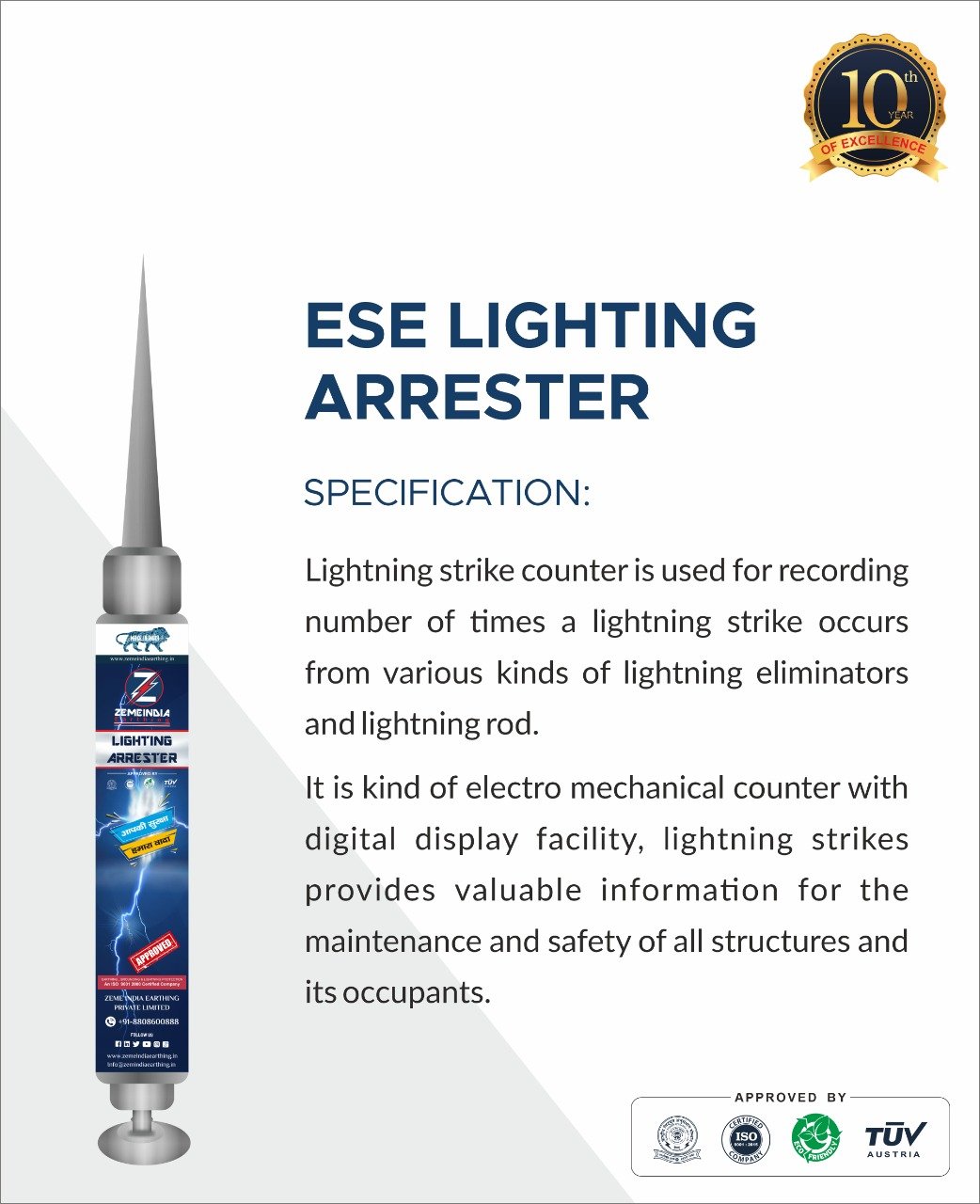 ESE lightning arrester, manufactured and distributed by Zeme India earthing Pvt Ltd, is new generation lightning stressors. As lightning can cause major problems for companies, damaging high rise buildings and other electrical equipment. To Protect our facilities from lightening a safe and efficient system is employed as Lightning Protection System ESE LightningProtection System is essentially a technically advanced lightning protection system. The distinctive features of the ESE Lightning Arrester allow the best performance.